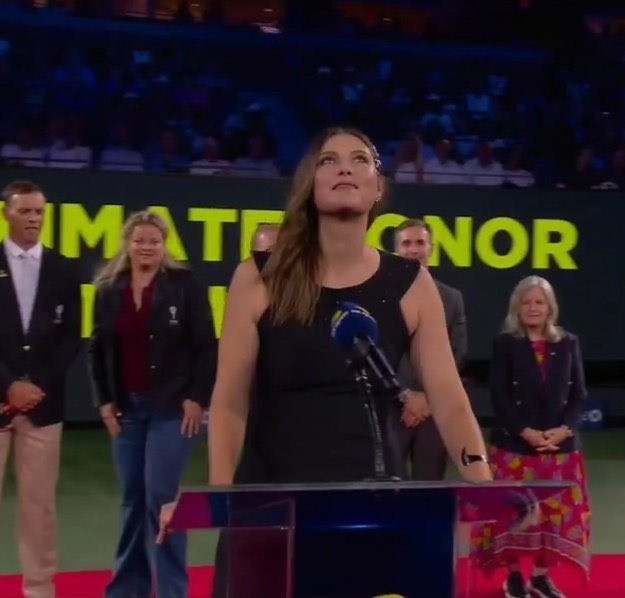 在美网从克里斯特尔斯手中接过国际网球名人堂戒指后表示:"纽约这座城市,是如此特别的地方和特别的球场。你们对我的旅程和职业生涯产生了不可思议的影响。我曾在这片球场经历了一些最美好的时刻,也面对过最严峻的挑战。你们见证了我的成长——从一个穿着奥黛丽-赫本风睡裙的年轻女孩,到19年后接受这枚美丽戒指和这项惊人荣誉。我发自内心地感谢你们。感谢你们让这场典礼如此特别。谢谢克里斯特尔斯、迈克和布莱恩。祝贺你们。"